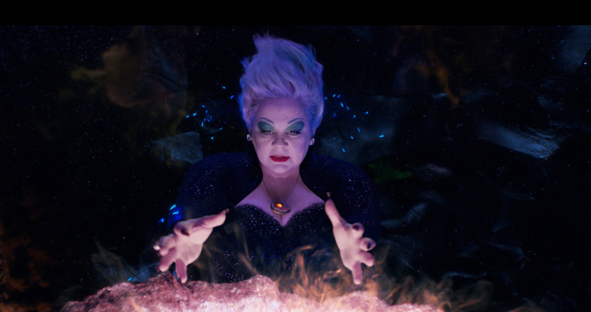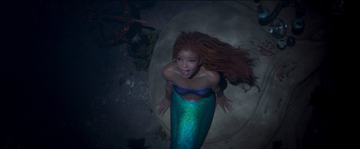 에리얼의 대표 색인 초록·자주 톤의 꼬리와 의상은 동화적 분위기를 살리려 했지만, 정작 영화 전반은 심해·폭풍우·저채도 장면으로 가득해 배경 자체가 화면을 눌러버린다. 여기에 의상의 채도까지 필요 이상으로 낮아지면서, 캐릭터는 장면 속에서 자연스럽게 부각되지 못한다.