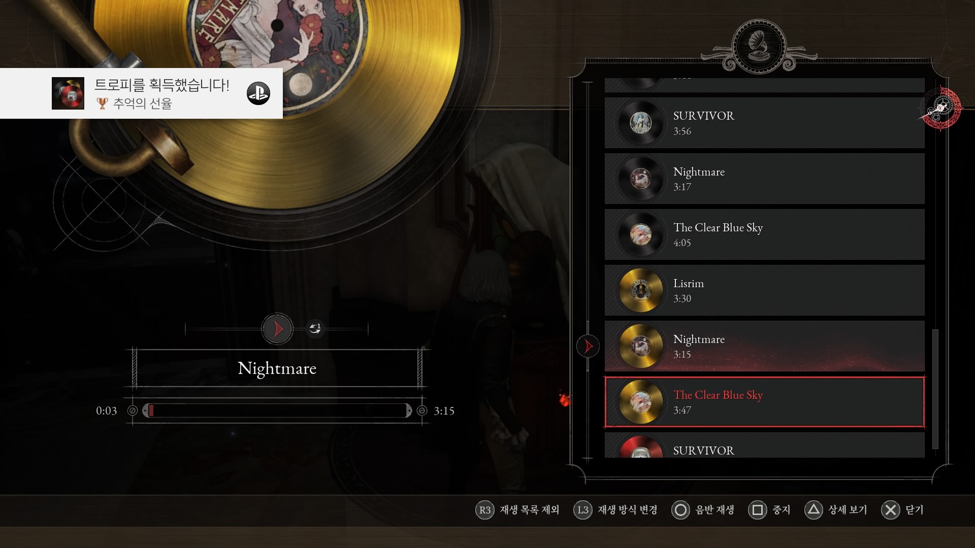 • 이미 피의거짓 플래티넘을 획득하고 다시 서곡을 켜서 트로피 수집을 하는 것이라면 1회차에서도 다 얻을 수 있다.(과거 데이터를 삭제안한 과거의 나 칭찬해) 하지만 1회차라면 금색 엘피판을 얻기 위해서는 무조건 2회차에서만 다 모을 수 있으니 1회차에서 다 모으는 건 그냥 포기하자...ㅜ