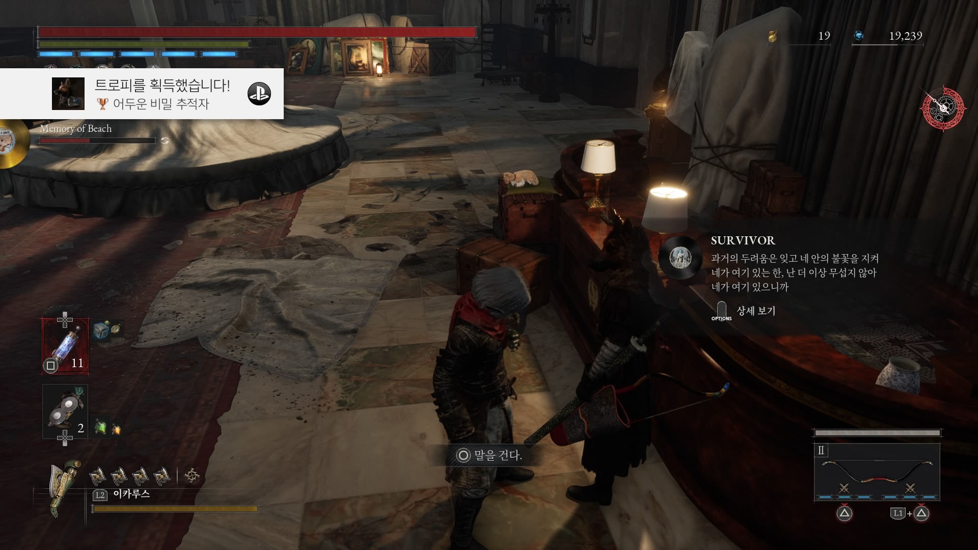 • 명예와 복수: 보스를 잡는데 재미를 느끼는 사람이 아닌 손가락이 그냥 평범한 나에게... 조력자를 못부르는 2개의 전투는 최악이라고나 할까? 각 보스 10회씩은 트라이했던 것 같다... 달팽이는 공간도 좁고 2페이지도 있고... • 비통에 눈먼 수호자: DLC에서 가장 임팩트가 강했다고 생각한 보스고 오래 붙어서 깼다!! 프리덤~~