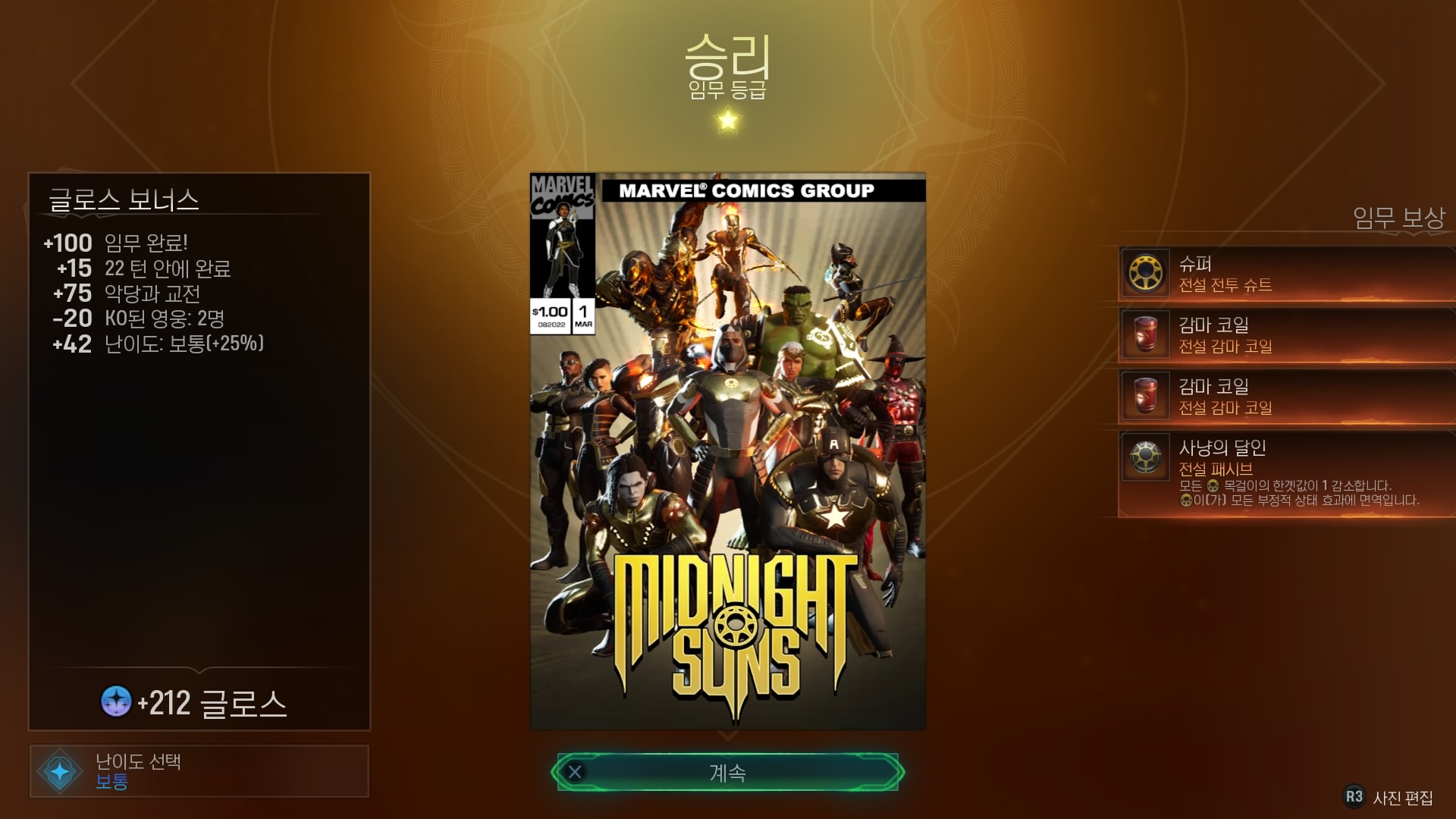 마블을 좋아해서 한번 연속으로 마블 게임을 했는데 다음은 좀 다른 게임을 해봐야겠다. 그래도 세계관을 좋아하고 전략 게임에 익숙한 플레이어라면 충분히 즐길 수 있는 게임이다. 플스4랑 게임이 안맞는건지 튕기는 것만 빼면 플래티넘 달성까지는 쉬워서 그냥저냥 한번 하기는 좋다.