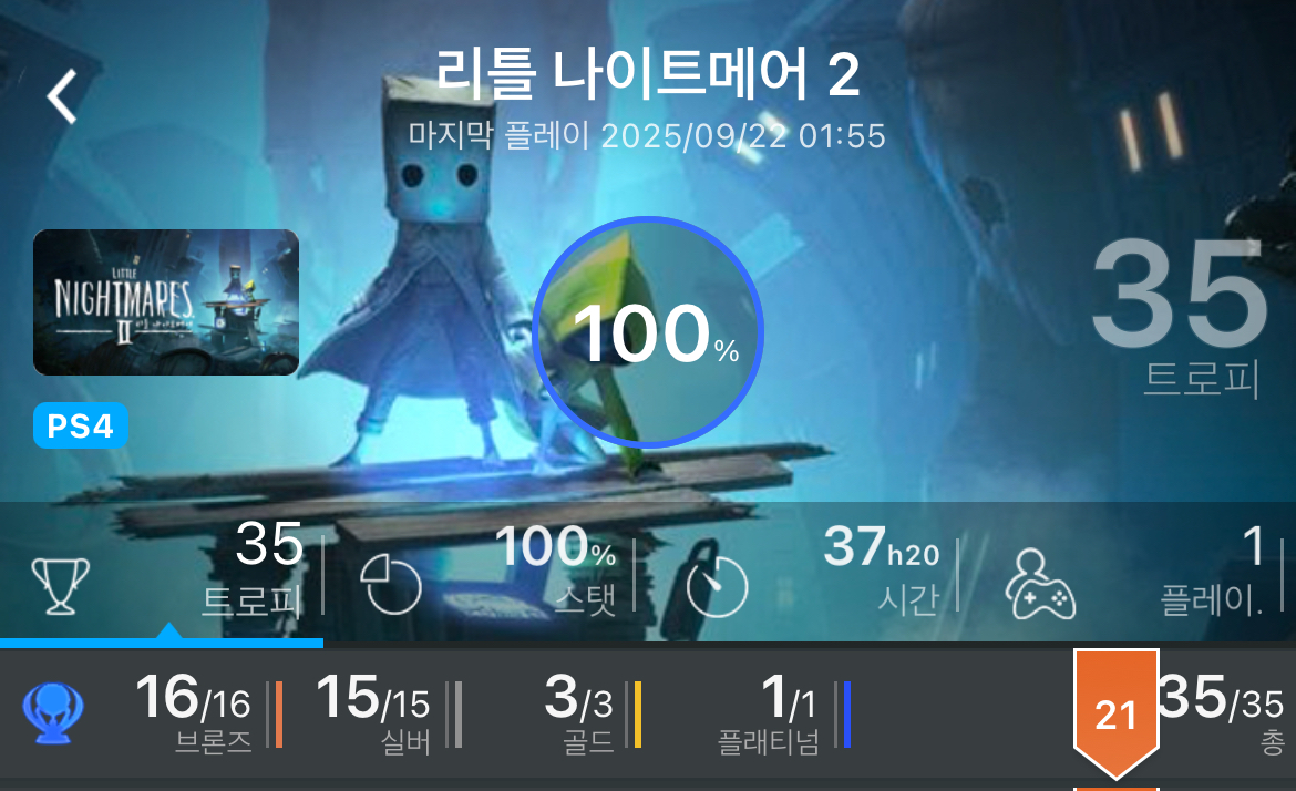 | 리틀 나이트메어 1 트로피 100% 성취 및 리뷰 (PS4/PS5) (1) | 2025.09.21 |
