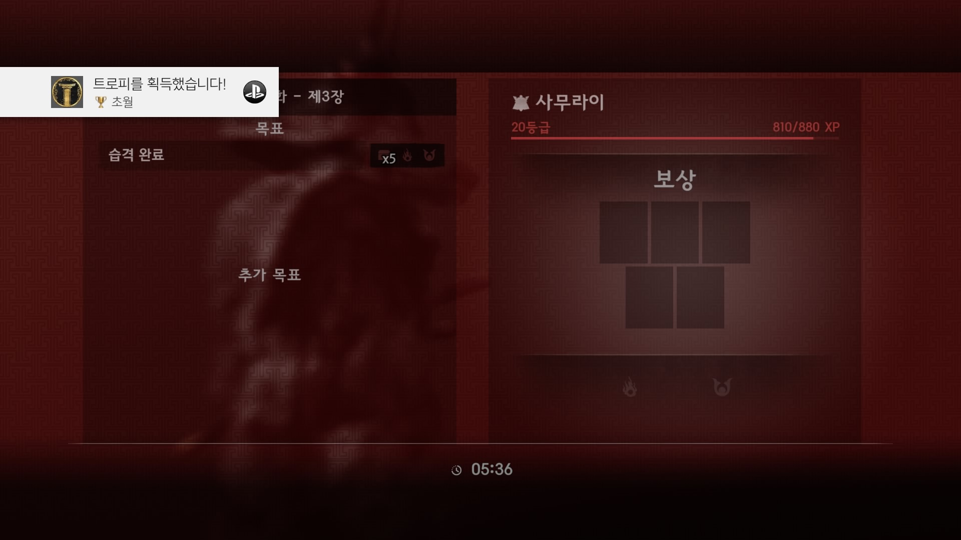 초월: 습격을 모두 완료하십시오.(고오쓰 중 가장 어려운 트로피이다.) 곧 멀티에 사람이 없다면 습득도 못한다. 최소 본인 포함 3명이 있어야하고 기본 레벨도 105정도는 넘어야 진행이 가능하다. 나는 운 좋게 사이사이 고인물 2명을 만나서 1,2,3장을 다 완료했다.(너무 다행…)