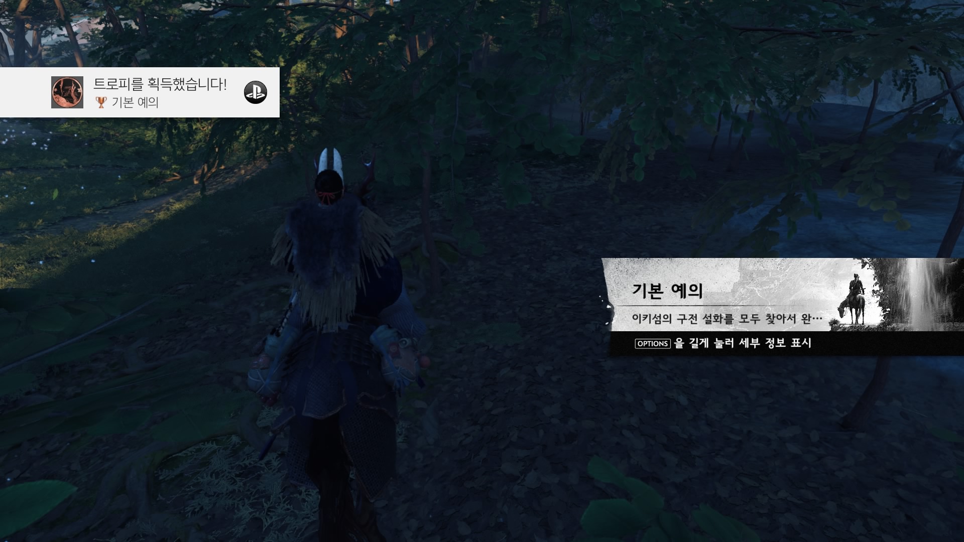 기본 예의: 이키섬의 구전 설화를 모두 찾아 완료하십시오. 구전 설화는 총 6개로 간단한 내용이다. 근데 여기서 우타와 대화하기가 있는데 전설에서 스토리 모드 9개를 다 한번씩은 완료해야 얻을 수가 있다. 어쩔 수 없이 전설과 이키섬 확장은 연결되어 있다.
