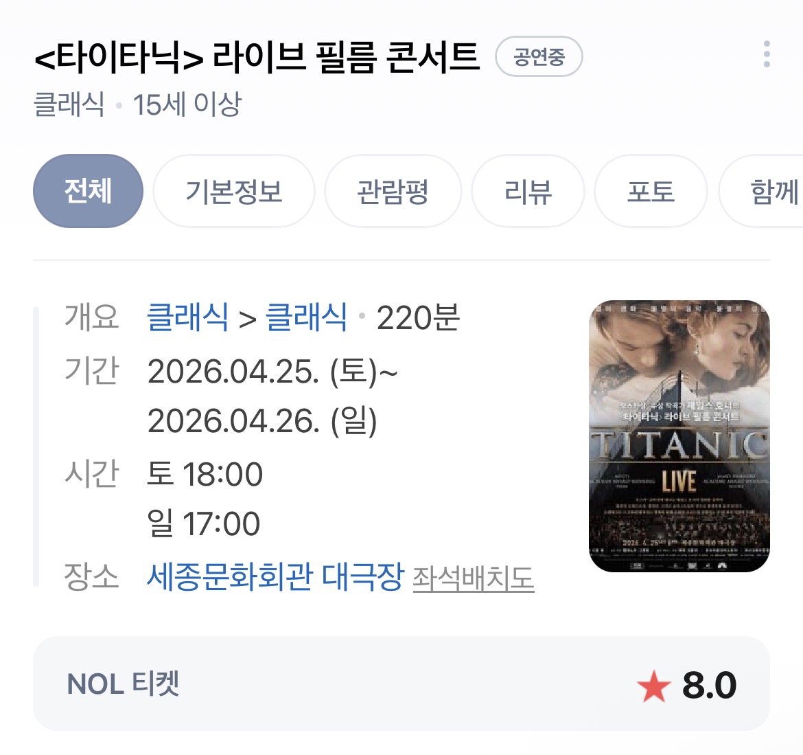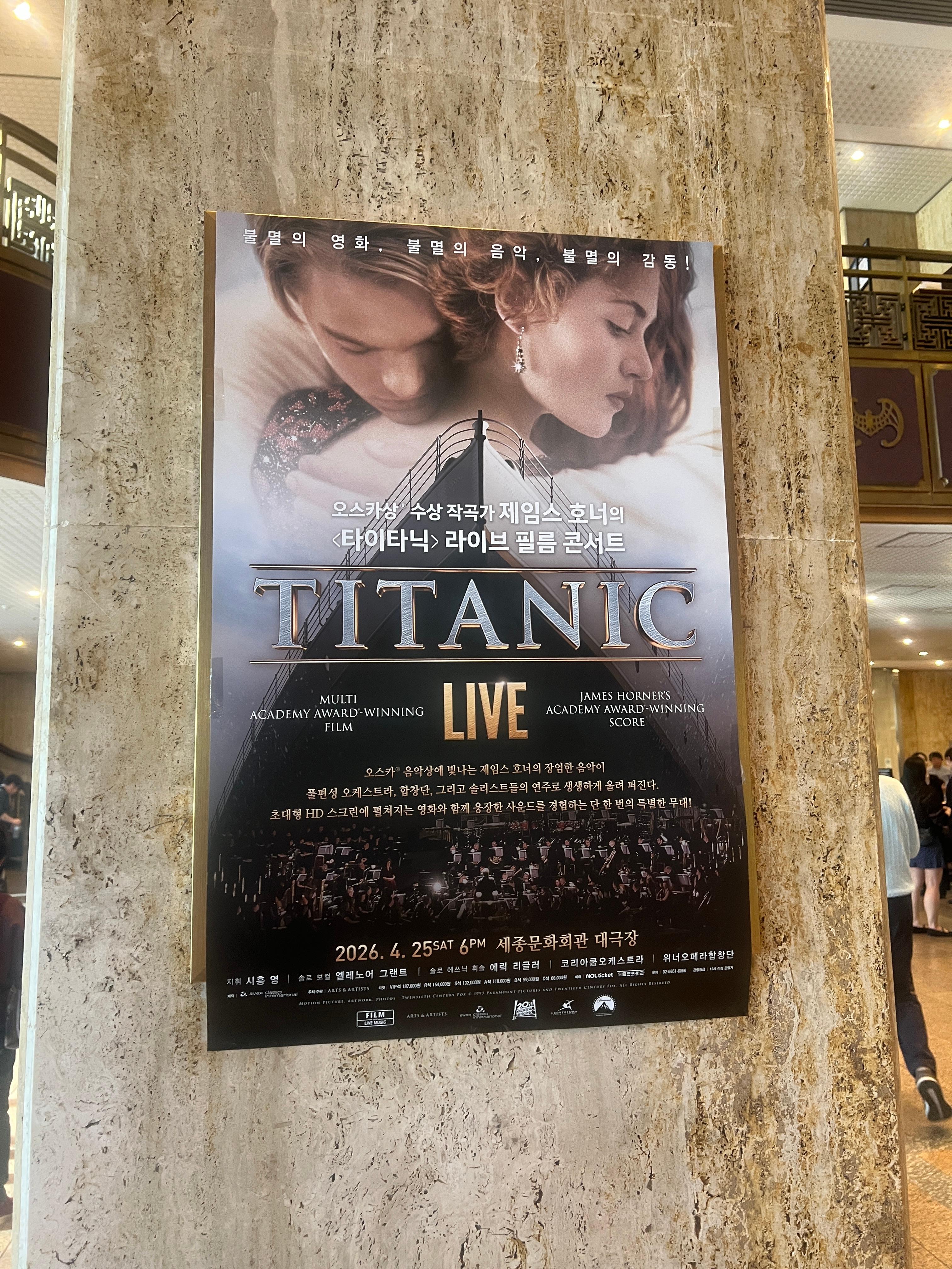 타이타닉 라이브 필름 콘서트로 봐서 음악이 너무나 좋았다고~~ 귀 호강이었다…돌비 영화관보다 이게 진짜 리얼 사운드라고 해야하지 않을까?